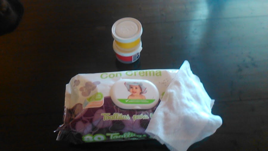 La siguiente cosa que vais a necesitar tener a mano son unas toallitas para poder limpiarles porque se mancharán bastante, y no solo las manos, por lo que realizando esta actividad no debéis dejarles solos si son niños pequeños si no queréis encontraros con alguna sorpresita desagradable por la casa.