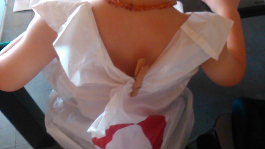 Lo primero que debemos hacer es ponerles una bata plastificada para que no se manchen toda la ropa con pintura.