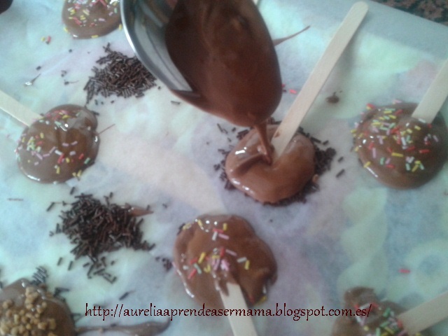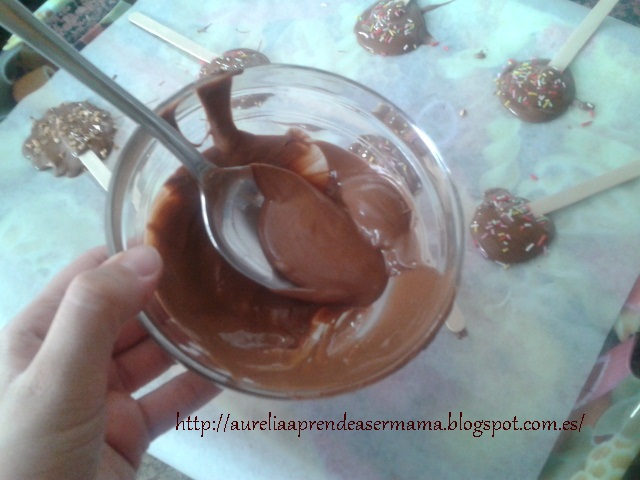Con un palito le daba la forma y lo dejaba en medio mientras con la cuchara se vierte otro poco de chocolate.