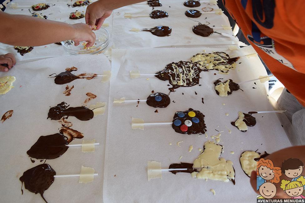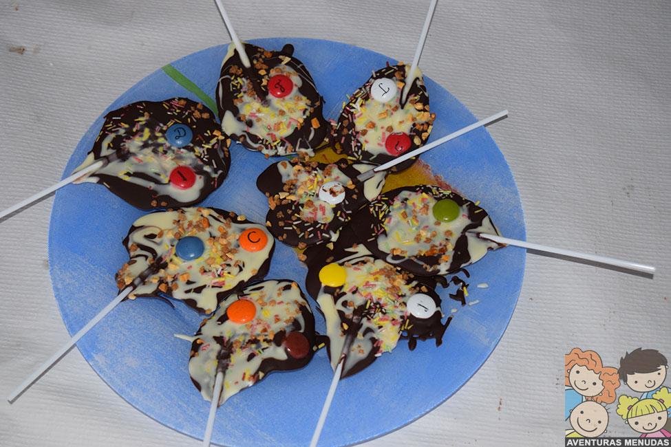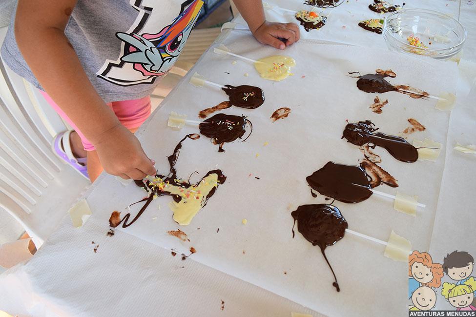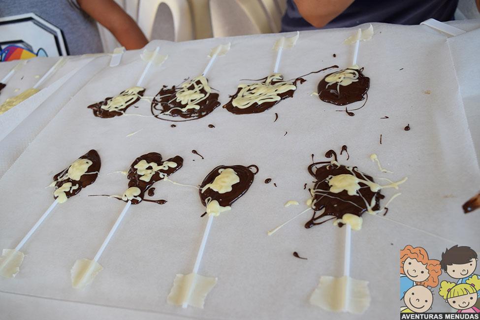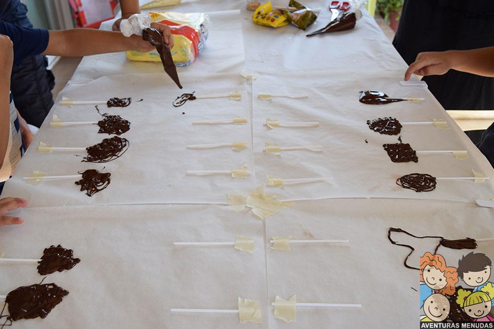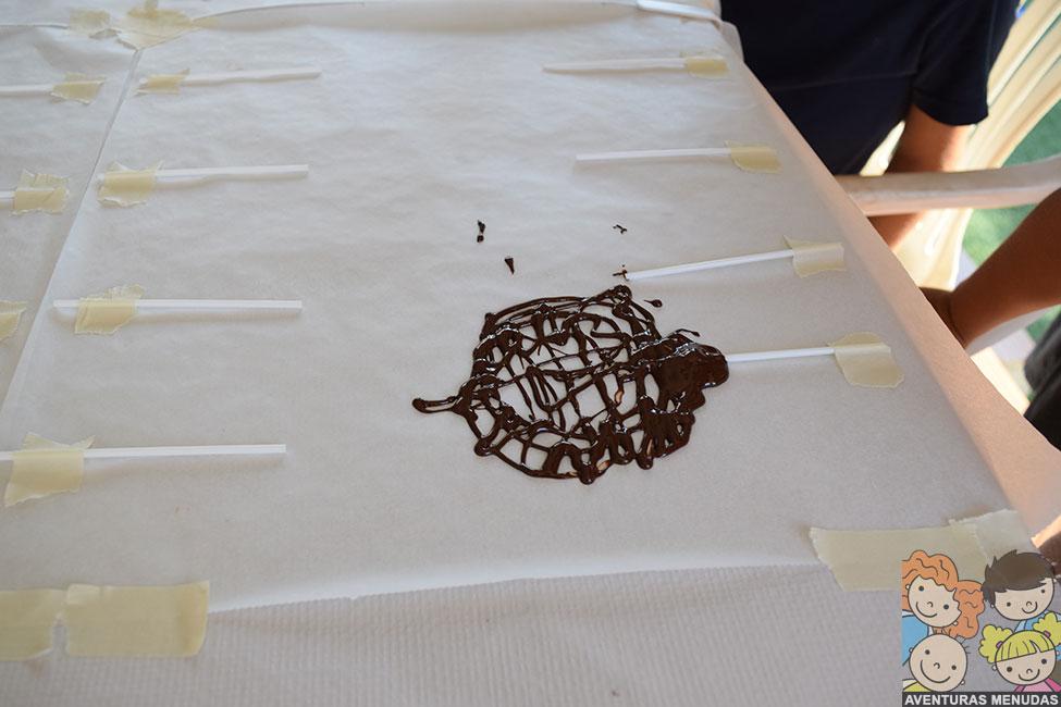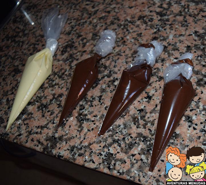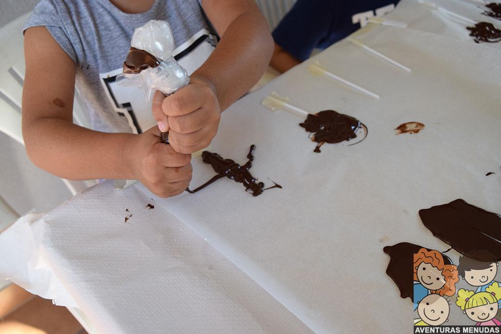 A continuación, cortáis la puntita de cada manga pastelera (poquito para que salga una cantidad controlable de chocolate) y les decís a los peques que pinten sus piruletas, cada uno como quiera.