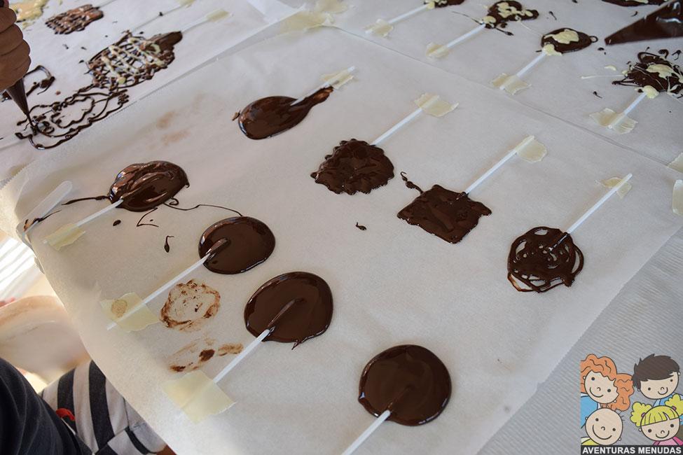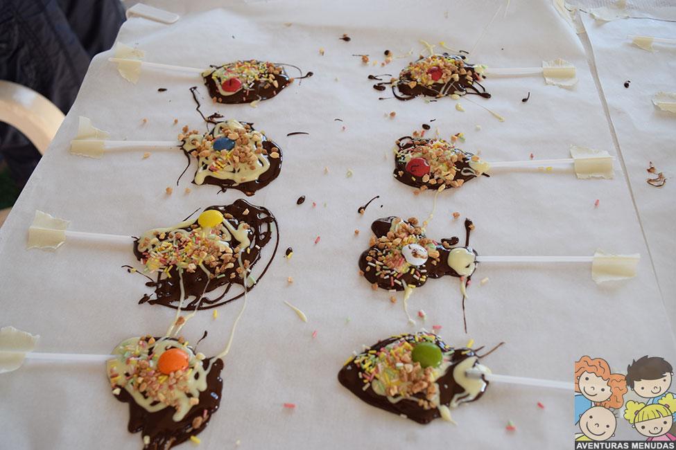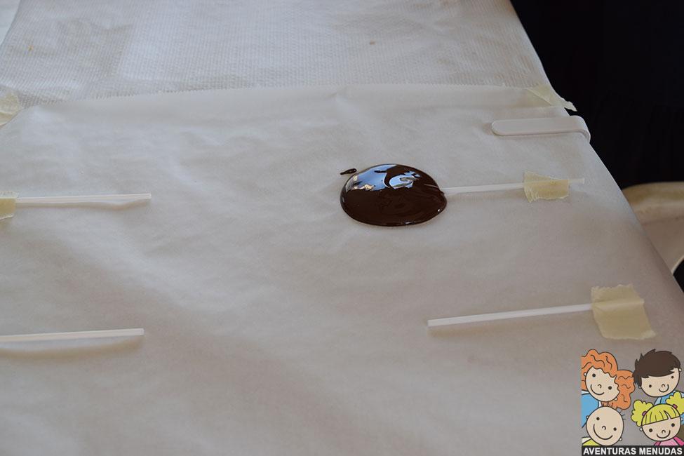 Es muy importante que reviséis que cada piruleta tenga una gran cantidad de chocolate que la una al palito, sino no podrá luego sujetarse con él y no se la podrán comer como si fuera una piruleta de verdad.