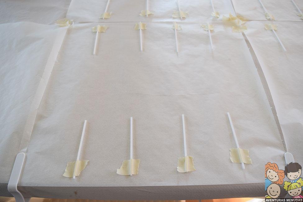 Preparáis la mesa donde vayan a dibujar sus piruletas, colocando un trozo de papel de horno para cada puesto, y encima, palitos de piruleta sujetos al papel de horno con celo. Poned varios en cada puesto para que puedan hacer múltiples piruletas cada uno.