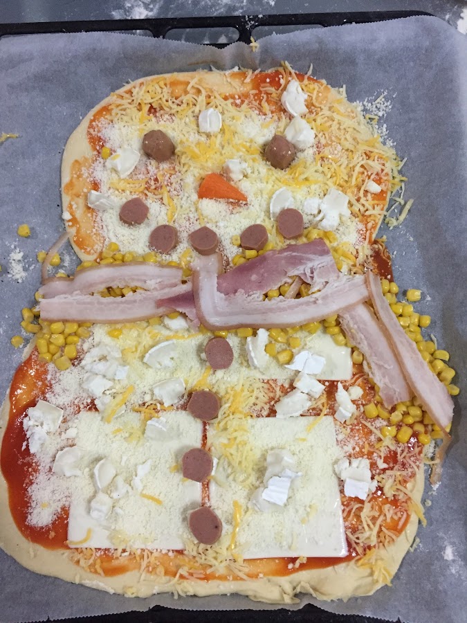 Hace unos dias os enseñe por instagram una cena muy invernal y que muchos me pedisteis la receta por privado pues aqui esta , pizza de quesos con forma de muñeco de nieve.