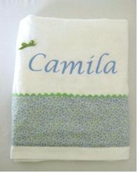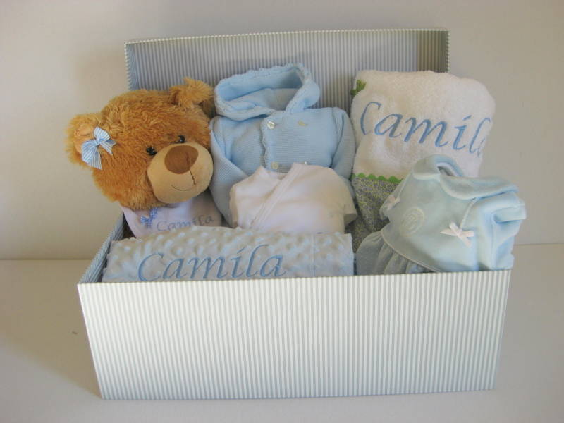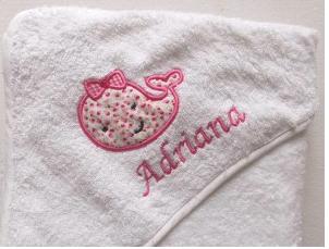 También las capas para su primer baño, son una monada, personalizadas y grandes, y combinadas con el resto de la canastilla si lo deseas.