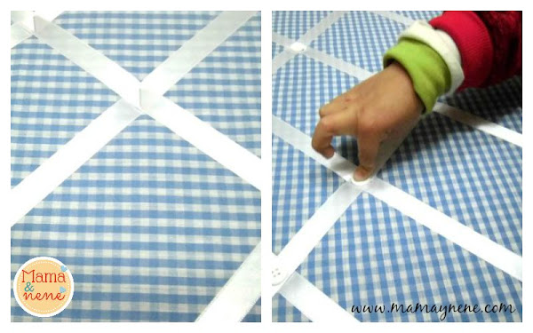 Colocamos las cintas en diagonales y tensamos para luego engrapar por la parte posterior al tablero o base rígida.
