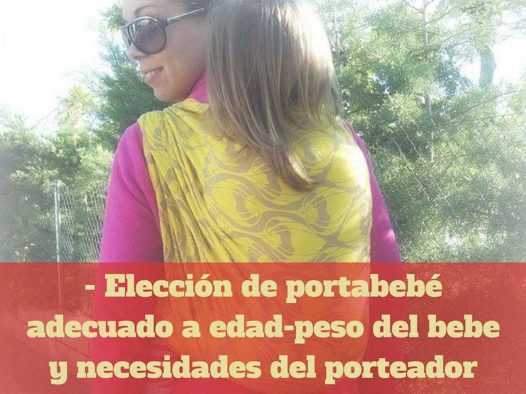 Debemos elegir un portabebé adecuado a la edad y peso del bebe/niño. Pudiendo elegir entre: bandolera, mochila, onbuhimo, fular (elástico y tejido) mei tai…teniendo en cuenta también si el porteador tiene algún tipo de lesión ajustándonos a ello.