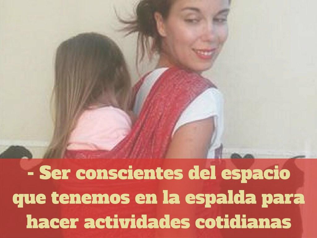 Referente al porteo a la espalda hay que ser conscientes de que tenemos a nuestro bebe a la espalda, teniendo cuidado al darnos la vuelta, agacharnos, sentarnos….para no dañar en ningún momento ni la espalda ni las piernas o la cabeza del bebe/niño.