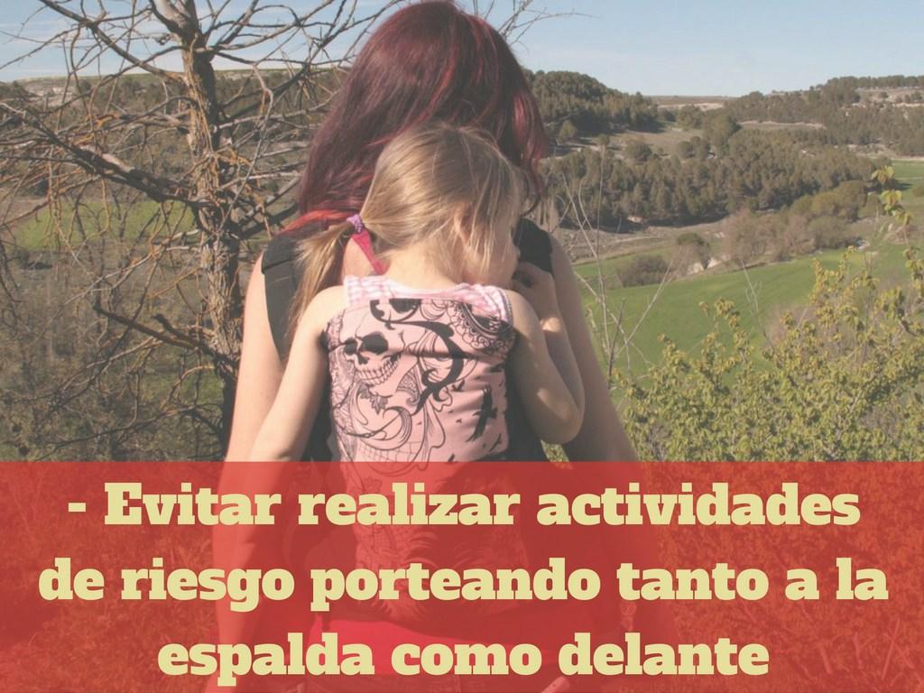 Y por ultimo y de lo mas importante, tenemos que tener cuidado con las actividades que realicemos porteando. Teniendo en cuenta de que no es un sistema de retención infantil, no debemos ir en bicicleta, ni patinar, escalada…ni deportes de riesgo porteando. Al igual que si podemos (con cuidado) limpiar y hacer ejercicio suave sin alto impacto, pero hay que tener cuidado mientras se cocina, plancha o usamos algún producto que pueda llegar a ser toxico.
