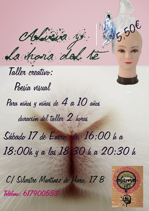 En la vecina Huercal Overa (Almería) nuestra amiga Maria Rosa que ha creado recientemente un espacio para sus interesantísimas propuestas, se encuentra junto al Parque Municipal. " SILVESART by Mojacar Factory Art" Este sábado realiza un evento que suponemos será bellísimo, Alicia y la hora del té,: Taller de poesia visual, imaginación desenfrenada... En dos horarios de 16:00 a 18:00 y de 18:00 a 20:00h