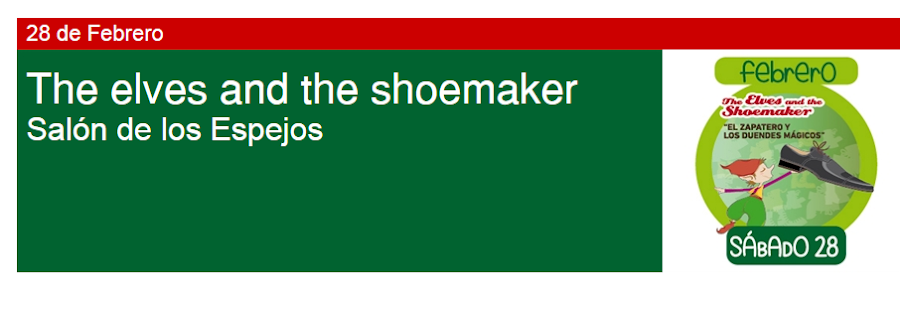 El sábado en Huércal-Overa (Almería) a las17:30 en el teatro de la localidad tenemos el músical TOY STORY con los personajes de las conocidas películas de pixar.En el Teatro Romea de Murcia, el sábado 14 a las 12:00 dentro del segundo ciclo de Cuentos clásicos y tradicionales dramatizados en inglés. Podemos ver El zapatero y los duendes