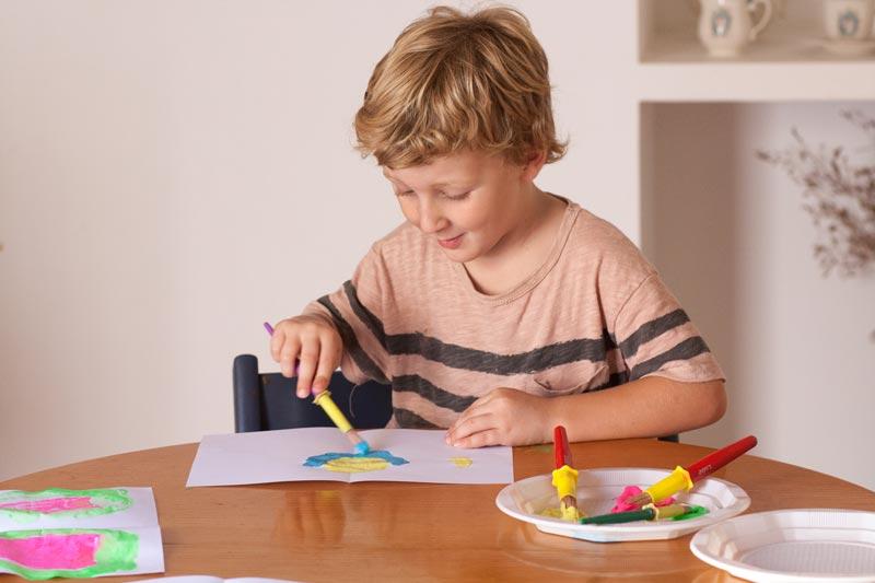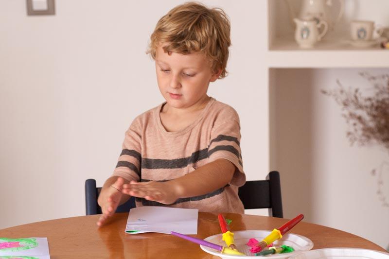 En primer lugar tendréis que preparar el material que vais a usar y la zona en la que vais a realizar la actividad. Prepara una mesa (coloca un mantel de papel si no quieres que se ensucie) y coloca un plato con los diferentes colores de témperas. Como ya os he mencionada en alguna ocasión yo suelo usar un pincel para cada color y así no tengo que tener un vaso con agua (que se puede derramar en cualquier momento) para lavarlo cada vez que cambiamos de color.