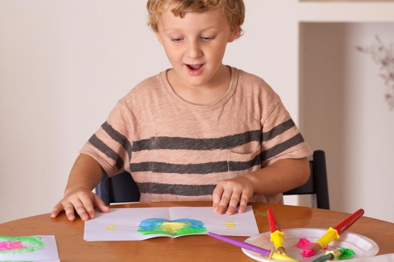 En nuestro caso hemos empezado con cartulinas en tamaño A4 y más tarde he cortado varios cuadraditos de 10x10cm para crear el proyecto artístico. A los cuadraditos pequeños también les he hecho un doble por la mitad para que Marc puede ver claramente donde está el centro de la cartulina. Disponedlos también sobre la mesa.