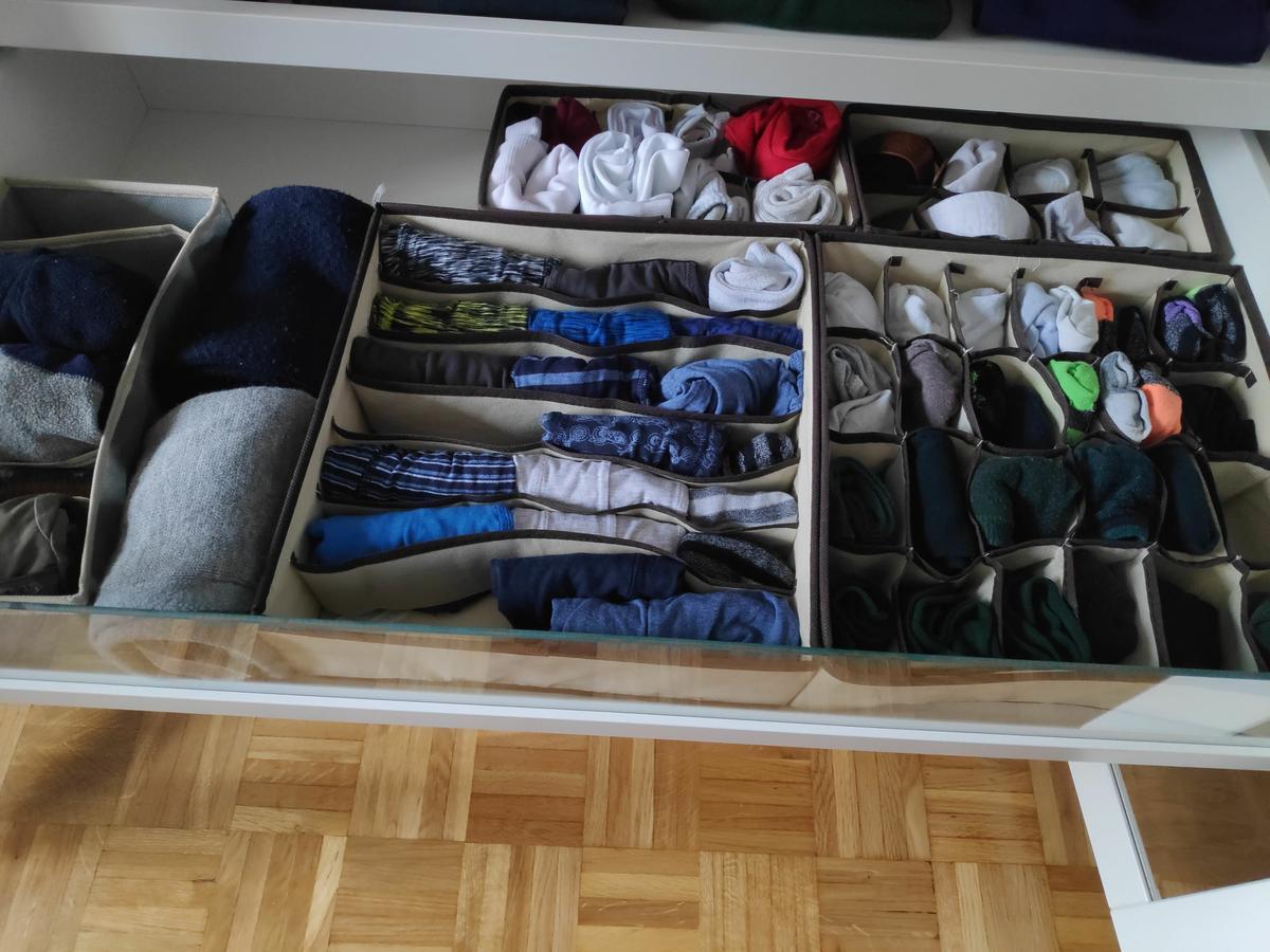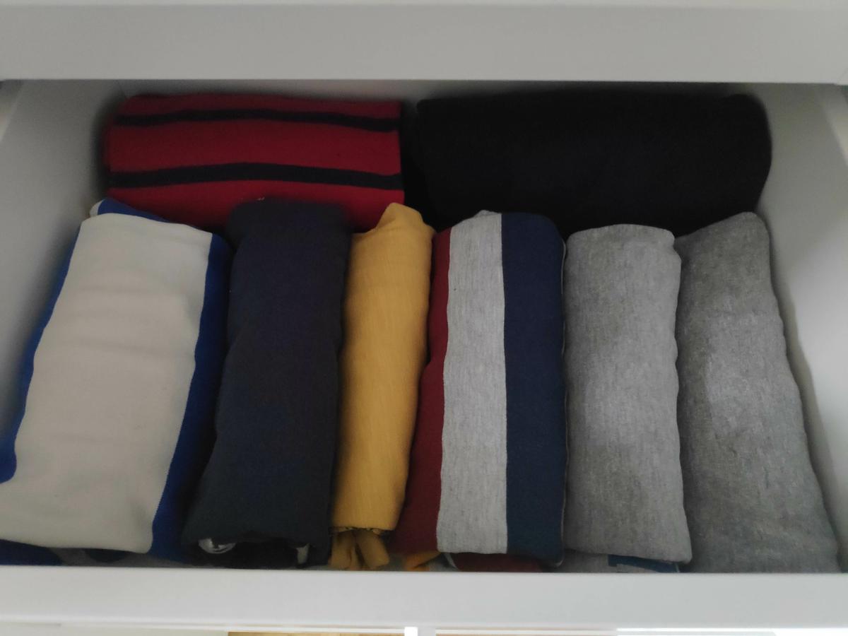 Para la ropa interior, las camisetas y ropa de deporte, utilizo el doblado vertical. Cabe más ropa y sobre todo se encuentra todo mucho mejor. Además con el sistema tradicional de poner la ropa apilada terminas poniéndote siempre lo mismo o acaba todo desordenado.