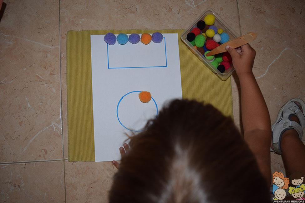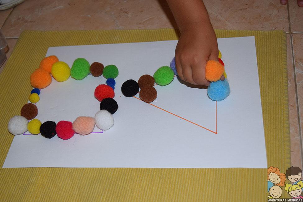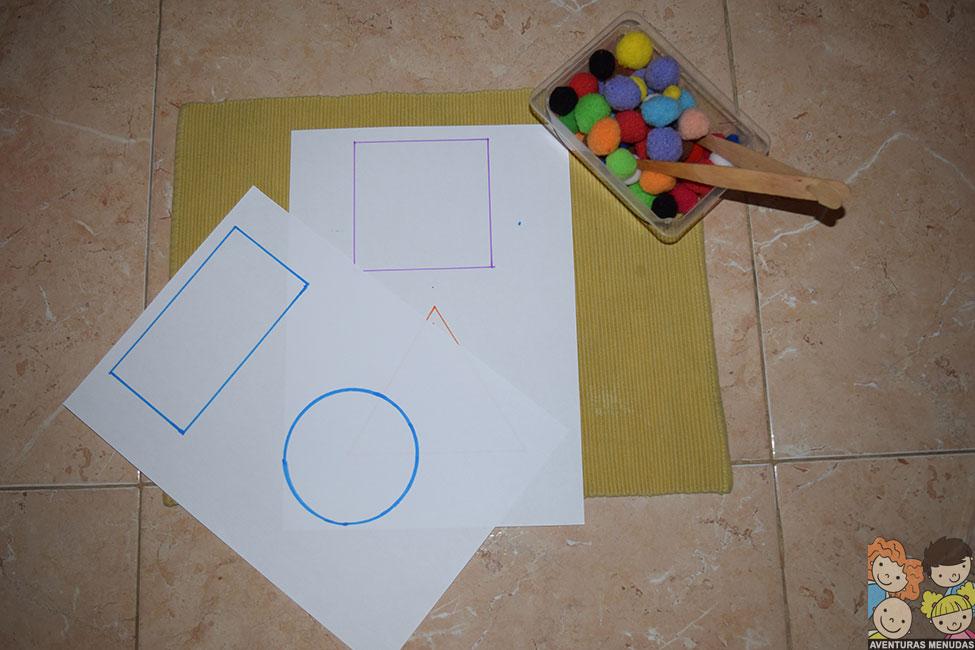 Dibujad con rotuladores en una hoja el contorno de figuras geométricas, usando para ellos una regla o bien usando de plantilla cualquier objeto que tenga la figura que queréis trabajar. Poned un mantelito individual en la mesa o en el suelo, si están jugando ahí, un bote con pompones y unas pinzas. Solo tienen que seguir el contorno de la figura, poniendo pompones sobre él.