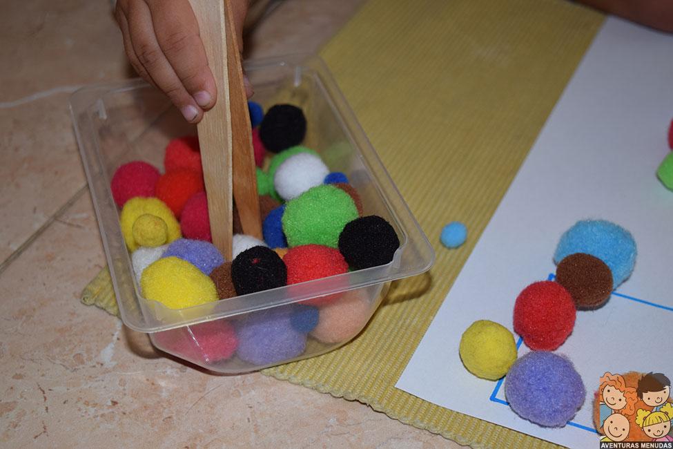 No hay que tener materiales complejos en casa para poder ponerlo en práctica. Con unas pinzas por ejemplo de la cubitera (para coger los hielos), pompones, papel y poco más, podéis hacer varias actividades, para las cuales se requiere poco tiempo de preparación.