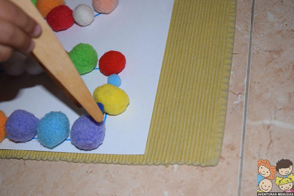 Si podéis, os recomiendo que pongáis pompones de diferentes tamaños, ya que les permitirán trabajar mucho más la psicomotricidad. Cuanto más mayores, con tamaños más tamaños podréis trabajar. Cuanto más pequeño sea el peque, trabajad con pompones más grandes, pero que a su vez sean fáciles de coger con las pinzas que uséis.