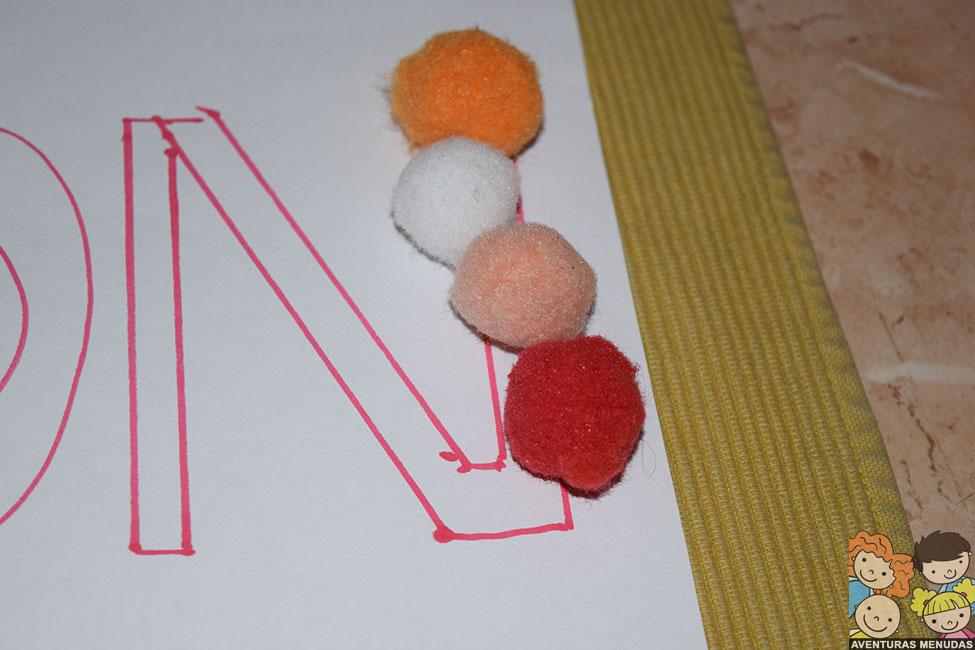 Lo mismo podéis hacer con las letras. Ya sean las diferentes letras del abecedario o bien, las letras del nombre de vuestros peques, con pompones pueden ir siguiendo el contorno para rellenar cada letra, usando las pinzas al igual que en el juego anterior.