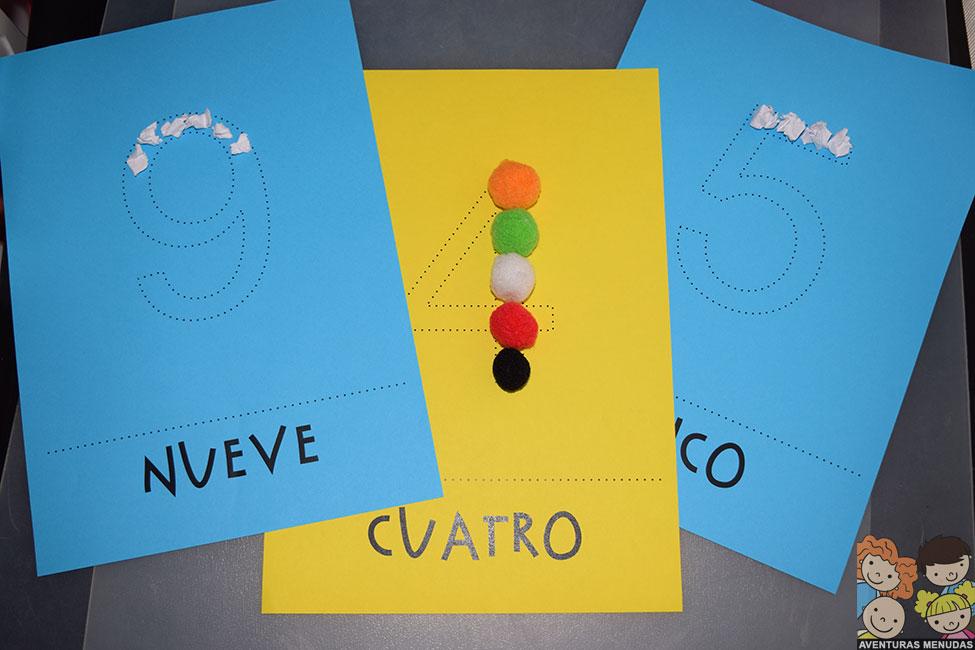 De la misma forma, podéis dibujar en los folios los números del 0 al 9, y de la misma manera, ofrecerles pompones o cualquier otro elementos que puedan manipular fácilmente, y que rellenen el número o sigan el contorno del mismo. Si están en fase de reconocer los números, podéis ir diciéndoles de qué número se trata.