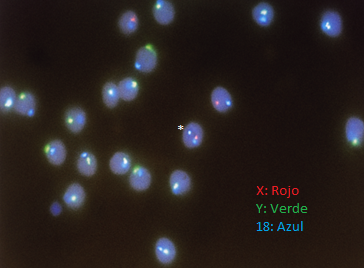 Mediante la unión específica de unas sondas fluorescentes de DNA a un cromosoma determinado podemos determinar el número de cromosomasque posee cada espermatozoide y así determinar si los niveles de espermatozoides con alteraciones en el número de cromosomas superan o no los límites de la normalidad.