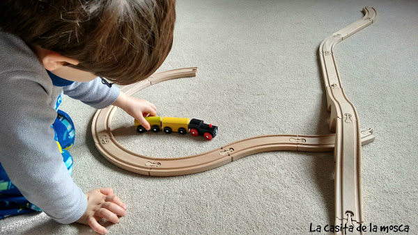 Se puede pasar horas jugando con este tren y haciendo diferentes combinaciones. Le encantan los trenes, los "nino-nino", los aviones, las grúas, los coches, etc. Como podéis ver en la foto también lo usa con su Arco Iris Montessori :)