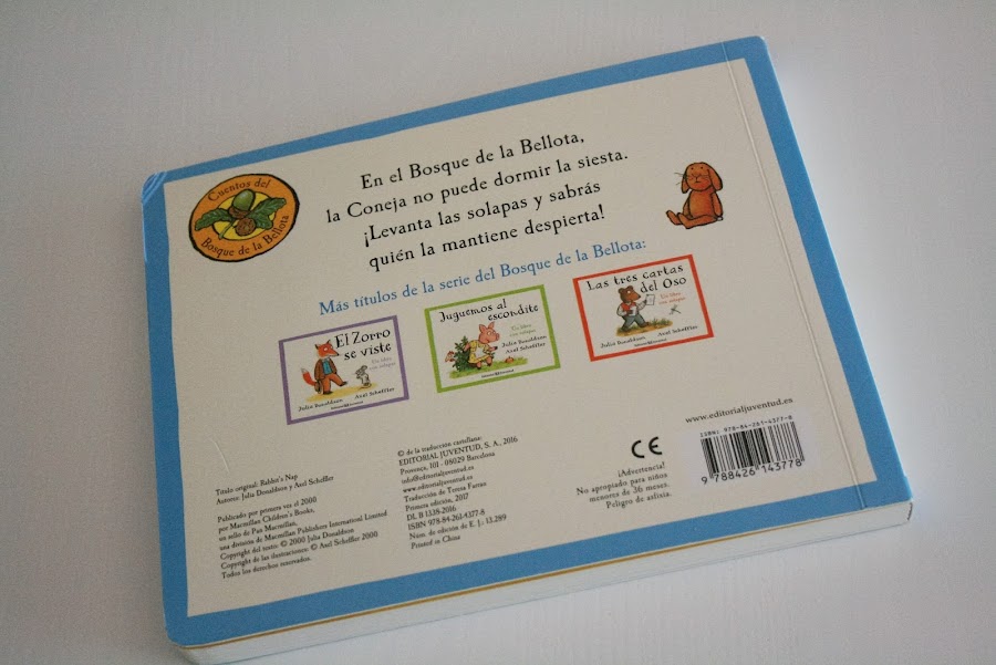Su autora Julia Donaldson y su ilustrador Axel Sheffler, de Editorial Juventud, en español, formato de cartón y con 14 páginas. Ideal para niños desde 0 a 2 años (aunque yo personalmente lo extendería hasta los 3 o 4 años de edad)