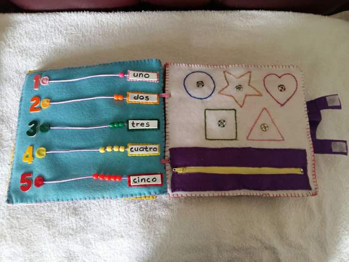 Eso es todo lo que hice en mi primer libro sensorial. De más está decir que a mi hija le encantó, es uno de sus juguetes favoritos, sabe que se lo hizo su mamá y es una muy buena alternativa para enseñarle cosas nuevas.