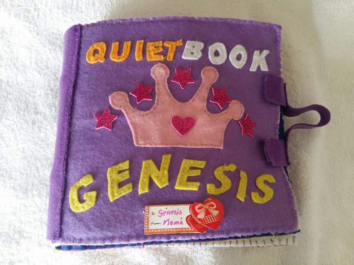 Como yo tengo una niña, elegí una coronita de princesa para el dibujo central, también podría ser un vestidito o una muñeca, y si es niño puede ser un tren o un cohete, y si lo queremos unisex podemos poner algún animalito que le guste a nuestro hij@, como una jiraga, un osito, etc. Aparte del dibujo central, le tenemos que poner un título, podemos elegir cualquier nombre de los que mencioné al inicio. Pero yo me quedé con "Quiet Book" porque es el más corto y me llevaría menos letras. Y luego el nombre de mi pequeña. Además podemos decorar con cualquier cosa que se nos ocurra.