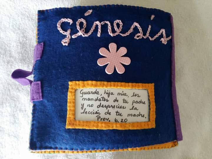El nombre de mi hija bordado a mano y sin patrones, con mi propia letra. Además he puesto un mensaje bíblico calando una ventanita y escribiendo sobre foami. Protegí el escrito con acetato: Guarda hija mía, los mandatos de tu padre, y no desprecies la lección de tu madre. (Proverbios 6.20)