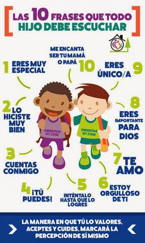 Si, por ejemplo, les decimos “tu puedes hacerlo”, generará en ellos la confianza y creerán que son capaces de realizar lo que ellos se propongan. Además, los psicólogos afirman que es importante que les digamos, por los menos una vez al día, lo mucho que los amamos. Frases como: “Estoy muy orgullos@ de tí”, “cuando necesites algo, estaré a tu lado” ayudan a que el pequeño sienta satisfacción, alegría y amor.