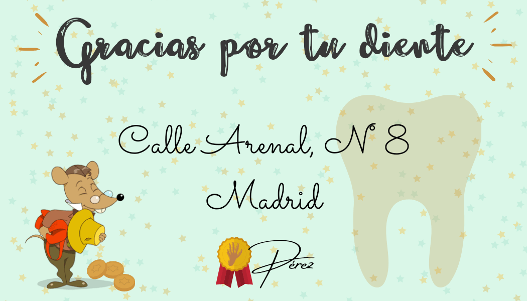Un recuerdo donde podrán indicar su nombre y la caída del diente junto la fecha. Por detrás del carnet, viene indicada la dirección postal donde reside el Ratoncito Pérez en España, actualmente más conocido como el museo del Ratón Pérez, que podéis visitar con vuestros hij@s para conocer su historia. A nuestra pequeña le encantó la excursion al museo, la llevamos con 4 añitos recién cumplidos y alucinó.