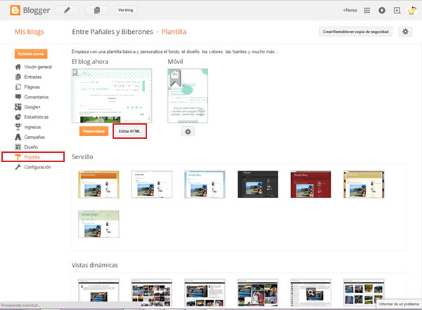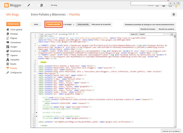 Para ello tendrás que entrar en «plantilla» y «editar HTML». A continuación, deberás hacer un click en cualquier sitio de la plantilla y pulsar Ctrl+f para que te aparezca el buscador (que se mostrará como un cajetín precedido de la palabra «search»), dentro del mismo debes escribir <head> y hacer un intro. Una vez hayas localizado la etiqueta <head> en la plantilla, deberás hacer otro intro y pegar justo debajo el siguiente código: