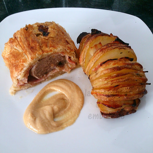 Lo cierto y verdad es que estaba delicioso. El cambio de champiñón por manzana fue un acierto porque el toque de dulce empasta muy bien con la carne y da mucho sabor, y yo pensaba que el hojaldre haría muy pesado el plato pero para nada es así, baja muy bien. Y la salsa, una esquisitez, nos chupamos los dedos.