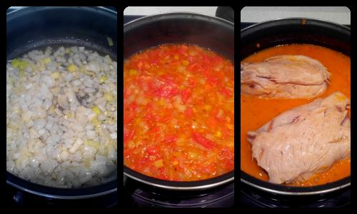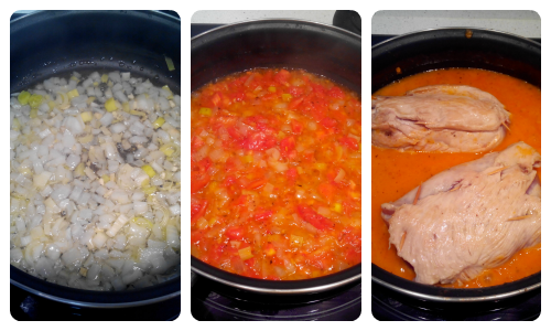 Picamos la cebolla, ajo y puerros y pochamos en una cazuela. Cuando la cebolla esté transparente añadimos los tomates troceados y las especias. Pasados unos 5 minutos, volcamos esto en un vaso de batidora, y batimos para hacer la salsa . Lo volvemos a echar en la cazuela e incorporamos los rollos.