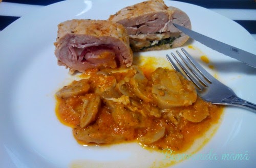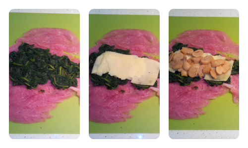 Salpimentamos la pechuga y ponemos en el centro las espinacas, las cubrimos con el queso y encima unos pocos champiñones. Enrollamos la pechuga , aquí depende de la forma en que nos haya quedado y nuestra habilidad, queda más bonita o no jeje. Para cerrarla nos ayudamos con unos palillos.