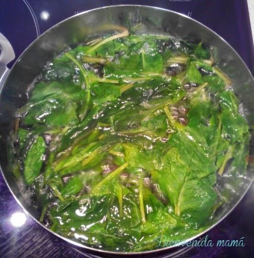 Empezamos por llenar una cazuela con agua y la ponemos a hervir con un puñado de sal. Cuando llegue al punto de ebullición, echamos las espinacas y las dejamos cocer unos 10 minutos.