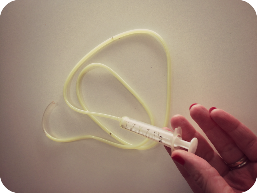 Para el siguiente paso necesitaremos una jeringa y un tubo de calidad alimentaria, llenaremos la jeringa y pasaremos la mezcla al tubo .