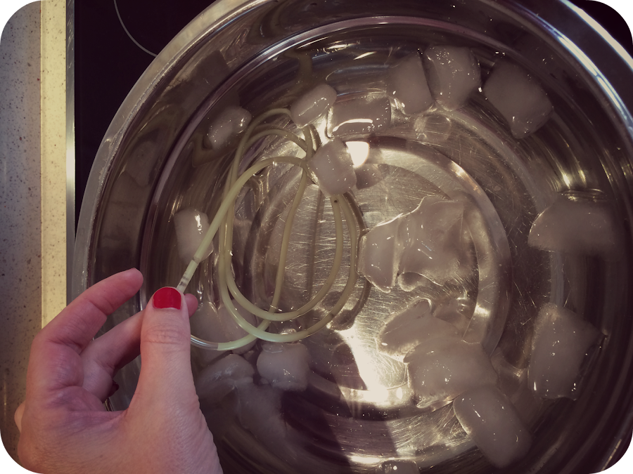 Cuando este el tubo lleno lo pasamos a durante 5 a un bol con agua fria, el agar-agar hará que se vuelvan sólidos pero cremosos.