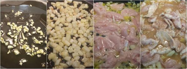 4- Cuando la patata esté medio hecha, añadir el pollo cortado a tiras, un poco de sal y de pimienta al gusto, el vino, la sopa y el agua hasta que empiece a hervir y se reduzca el líquido, quedando una salsa más espesa mientras que el pollo se termina de hacer.