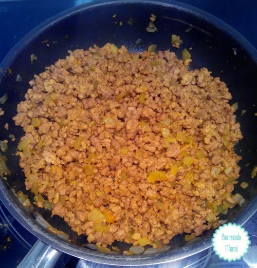 Cortamos y picamos la cebolla, el puerro y el ajo. Ponemos en una sartén un chorrito de aceite de oliva y pochamos estas dos cosas. Cuando la cebolla esté transparente, echamos la carne y cuando esté medio hecha, añadimos el curry, y dejamos cocinar hasta que esté doradita.