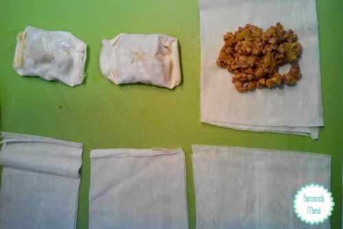 Cuando esté la carne lista, ponemos en otra sartén un buen chorro de aceite y calentamos. Mientras, cogemos 3-4 láminas de pasta filo y las cortamos en 6 cuadrados. Le echamos en el medio un par de cucharadas de carne, y la envolvemos. Así con las otras láminas.