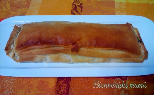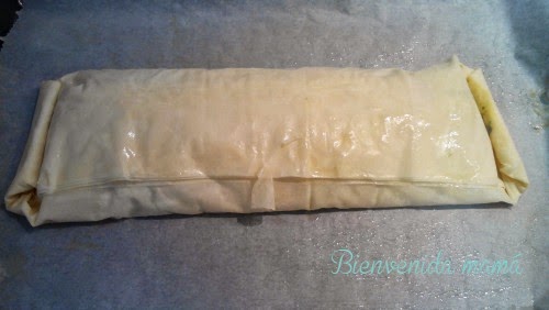 Abrimos la pasta filo* y cogemos 4-5 láminas, que ponemos encima del papel. Ponemos en el centro de la masa el relleno.