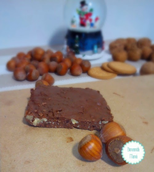 Mientras troceamos las galletas y ponemos en boles distintos las avellanas, nueces y galletas. Cuando acabe el tiempo de la thermomix, repartimos la mezcla en estos boles. Revolvemos para mezclarlo bien, y echamos en los moldes. Los metemos en la nevera a enfriar.