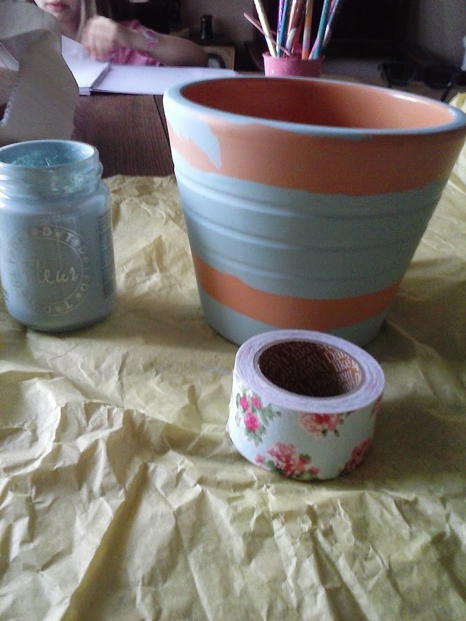Mi hija pintó parte de la maceta, luego la retoqué y, una vez seca, pequé washi tape de tela con flores, también adquirida en Delipapel, en la parte superior y la inferior de la macetita. Después, pintó mi nena el platito sobre el que pusimos la maceta.