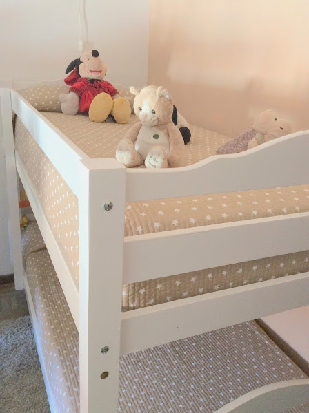 El tema es que unas literas no es algo que a mi me apasione demasiado, pero mira, eran de un familiar, estaban prácticamente nuevas y me ahorro un dinero hasta que pueda comprarle o adaptarle habitaciones separadas. También tengo 2 camas nuevas, una la que compramos con la habitación de Xián cuando estaba embarazada y otra preciosa de forja blanca, pero para compartir habitación me iba a quedar muy justo para todo lo demás. Así que la litera de momento me pareció una opción.