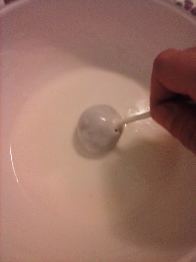 Sacamos los palitos de la bolita y mojamos en los Candy Melts fundidos la parte que queda incada en la bolita. Los niños nos pueden ayudar perfectamente. Las metemos en la nevera una media hora para que endurezcan y se fijen bien los palitos.