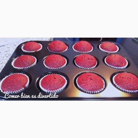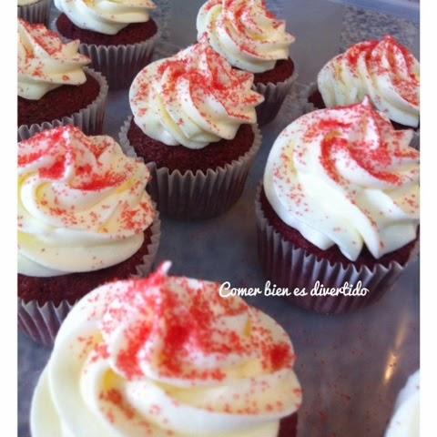 - Decoramos nuestros cupcakes una vez fríos con la crema, con la ayuda de una manga pastelera, y el azúcar de color rojo.