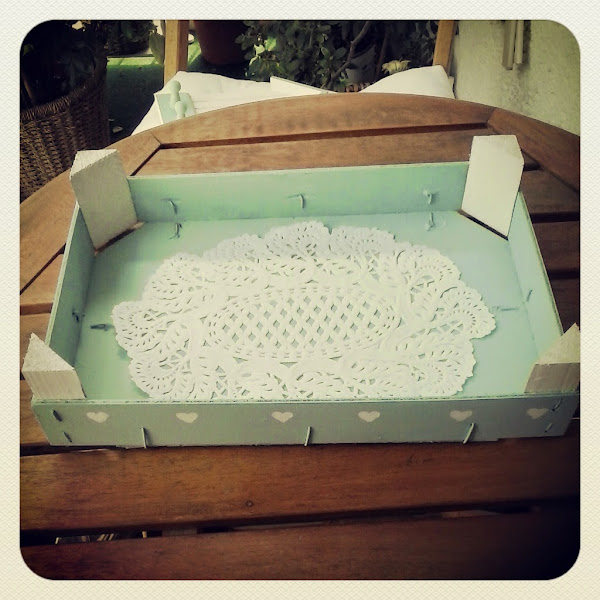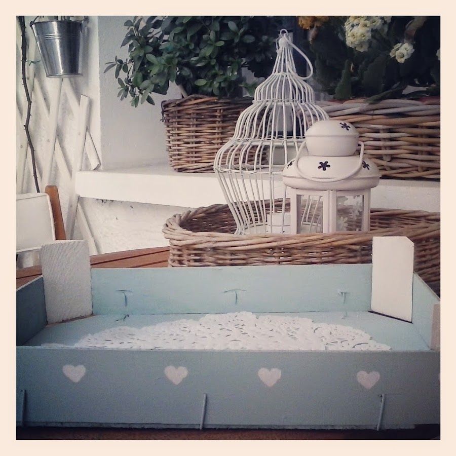 Mi nena y yo pintamos una bandeja de fresas con Chalk Paint Fleur Cape Town Blue, después la decoré con corazones pintados con Cahlk Paint Fleur White Chalk. Le pegué una blondita, cubrí con cera y lista para mi terracita!! En ella tengo la jarrita y los utensilios que utiliza mi nena cuando me ayuda con las plantitas.