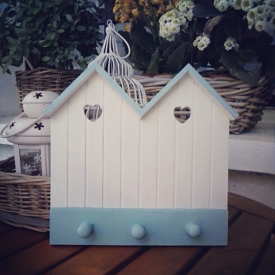 La azul y blanco era una casita de madera ya algo viejecita, con los efectos de los años y del daño del exterior. Quedó como nueva con las mismas pinturas que la bandeja y la casita-percha.