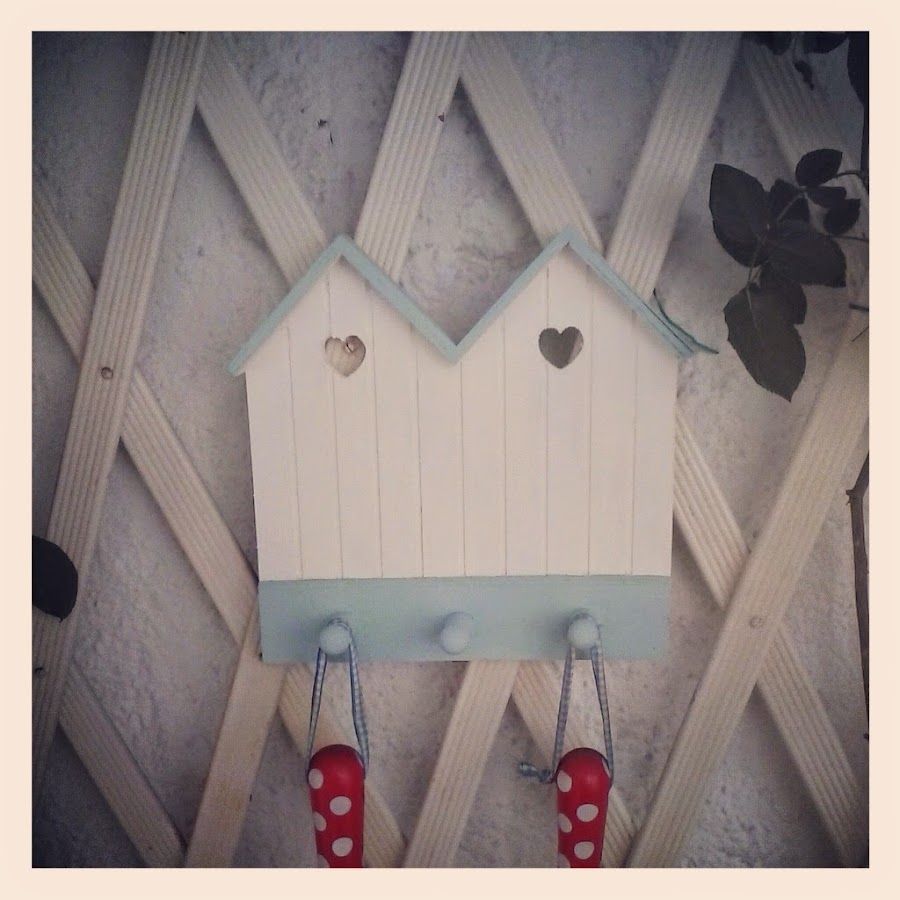 En este caso mi nena y yo decoramos una casita-percha muy mona de madera que compré en Deli Papel para poder colgar en la terraza mis utensilios de jardinería. Las pinturas utilizadas son las mismas que en la bandeja anterior. Ahora tengo la terraza más ordenada y monísima.