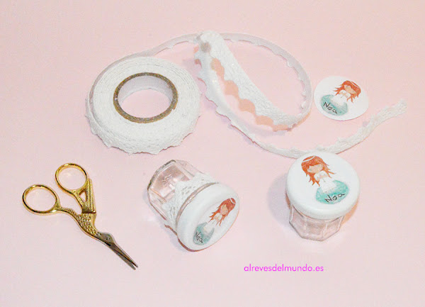- Después, decoramos el bote con cita de encaje adhesiva